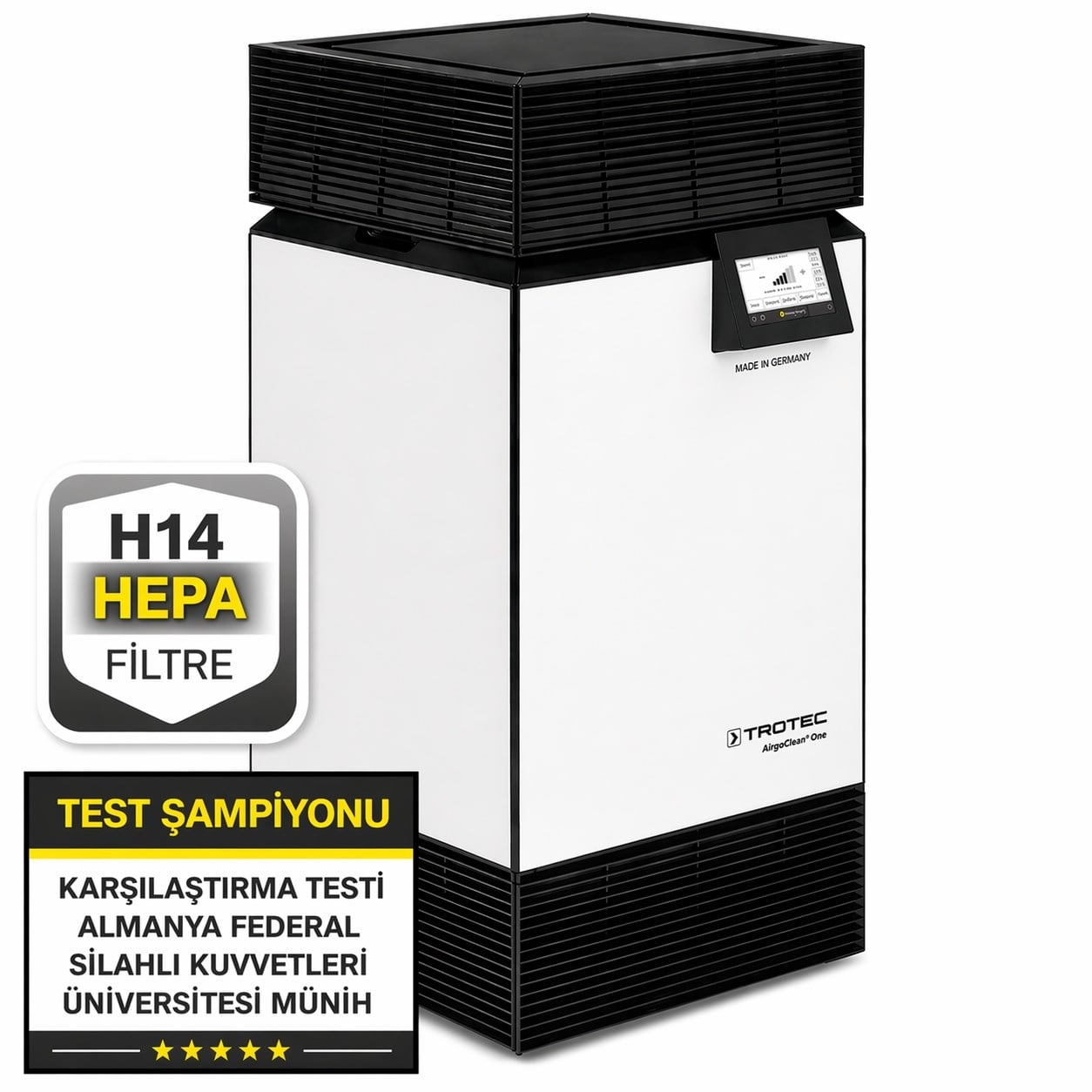 Cihazın yüksek performanslı H14 HEPA filtre sistemi bilimsel olarak test edilmiştir. Her filtre Almanya’da üretilmekte, tek tek test edilmekte ve sertifikalandırılmaktadır. Bu sayede AirgoClean® One, yalnızca güçlü değil, aynı zamanda güvenilir ve sürdürülebilir bir hava temizleme altyapısı sunar.