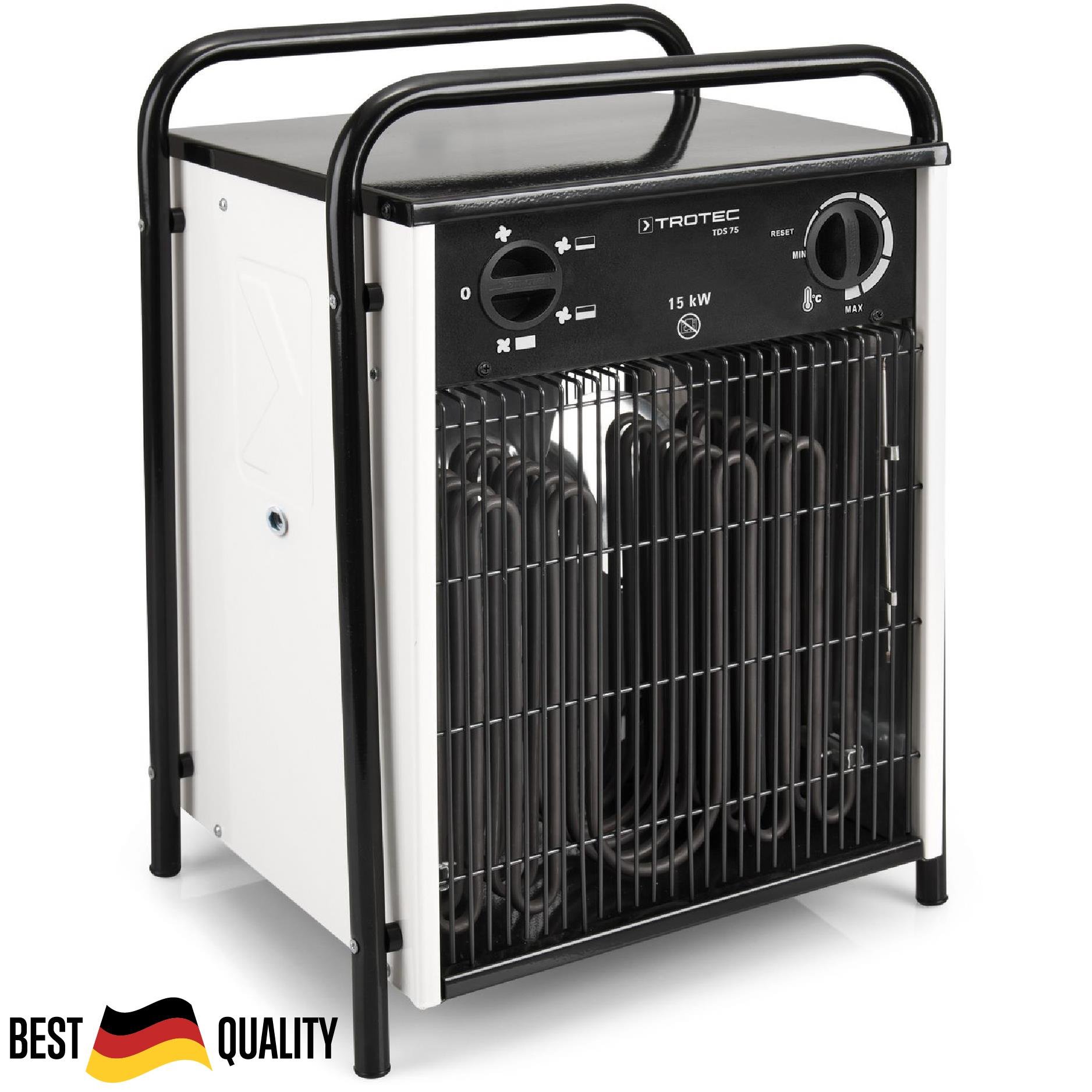 Trotec TDS 75, 5 kW, 10 kW ve 15 kW olmak üzere üç farklı ısıtma kademesiyle donatılmış, güçlü bir endüstriyel elektrikli fanlı ısıtıcı modelidir. Büyük hacimli alanlarda dahi etkili sıcaklık kontrolü sağlar ve uzun süreli kullanımda verimliliğiyle öne çıkar. Bu özellikleri sayesinde, klasik çözümlerden çok daha fazlasını sunar.