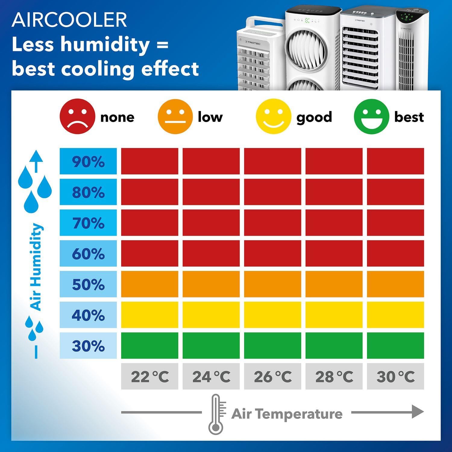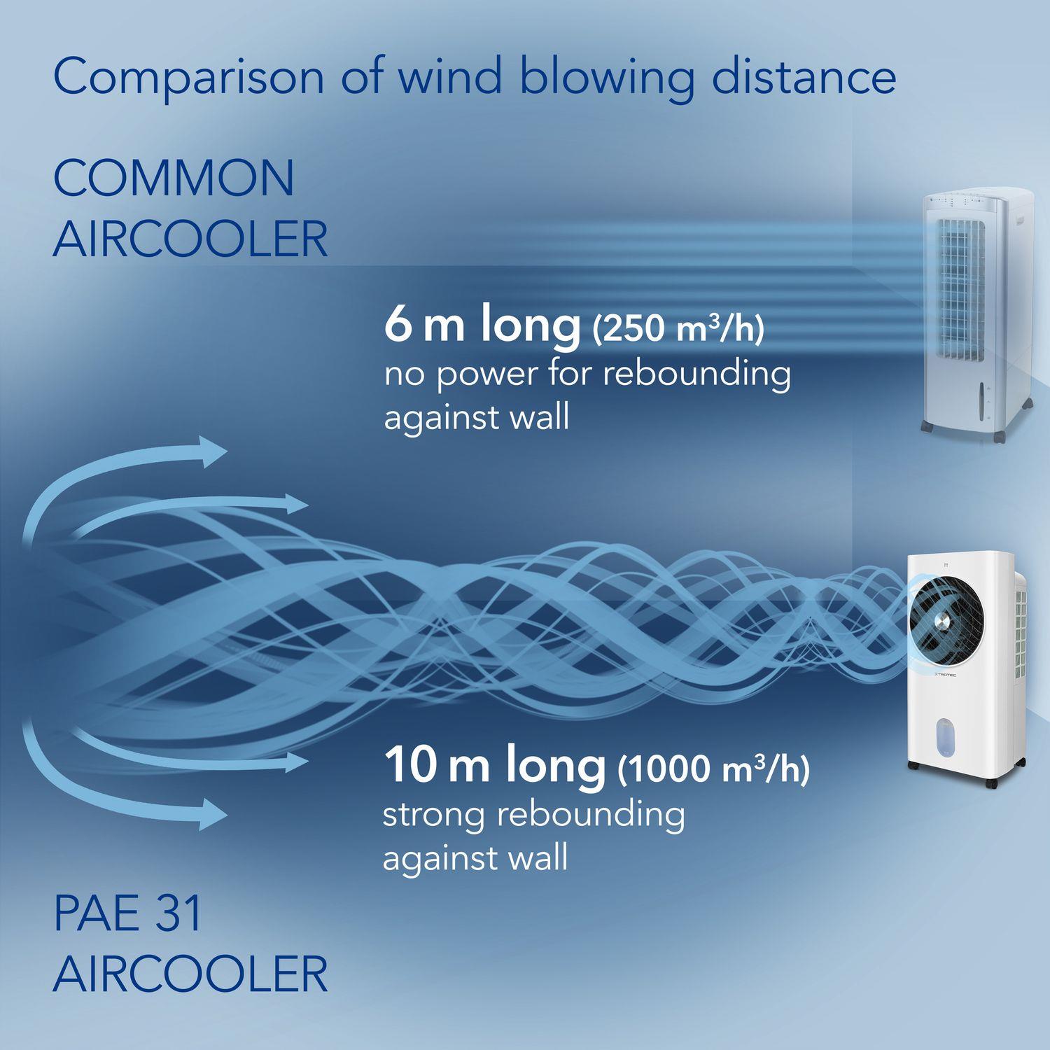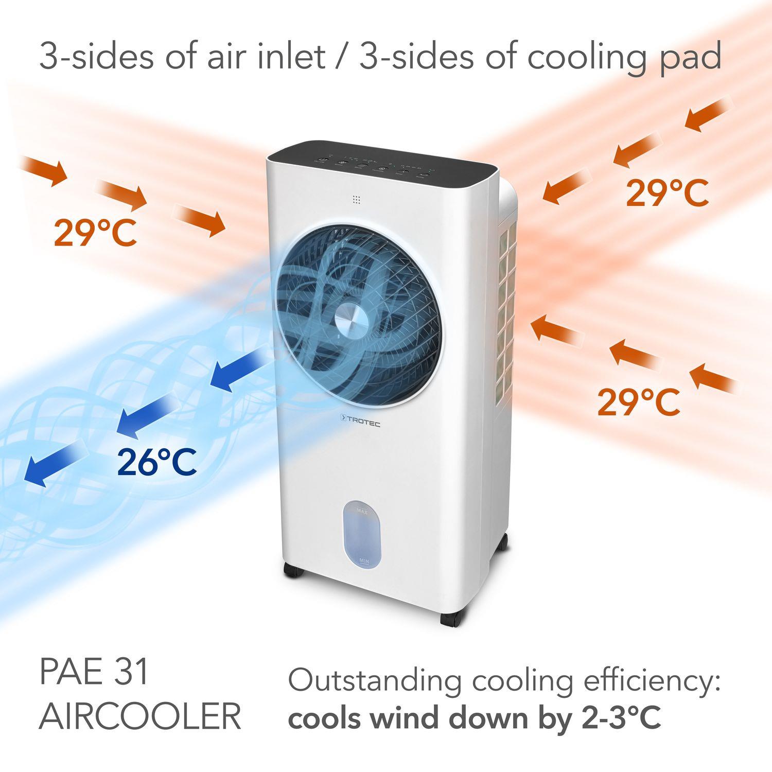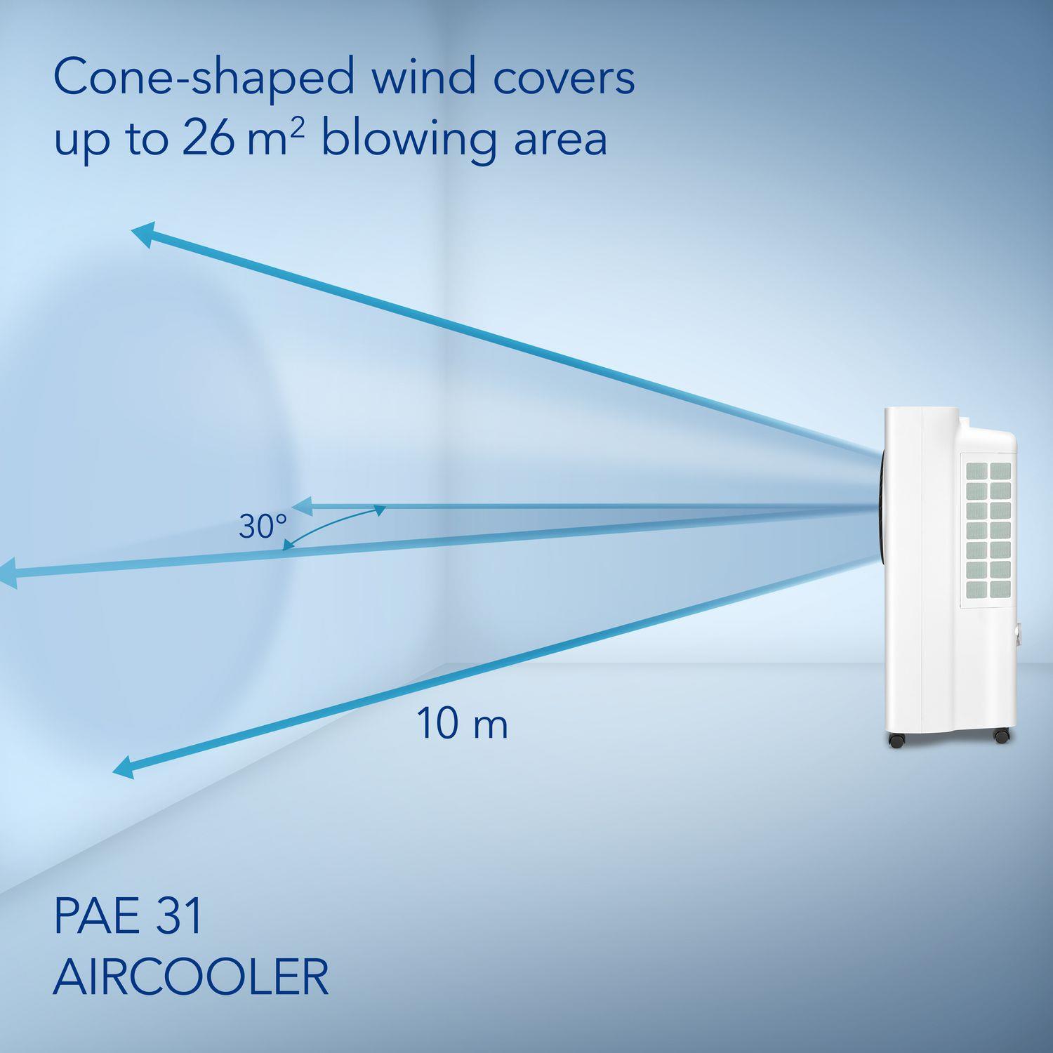 PAE 31, güçlü Turbospin hava akışı, doğal buharlaşmalı soğutma teknolojisi ve çok fonksiyonlu yapısıyla etkili bir hava soğutucu çözümüdür. Yüksek hava debisi ve geniş kapsama alanı sayesinde büyük yaşam ve çalışma alanlarında hızlı serinlik sağlar. Fan, soğutma ve nemlendirme fonksiyonlarını bir araya getiren bu cihaz, yıl boyunca konforlu bir iç mekan iklimi oluşturmak için ideal bir seçimdir.